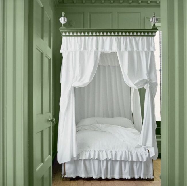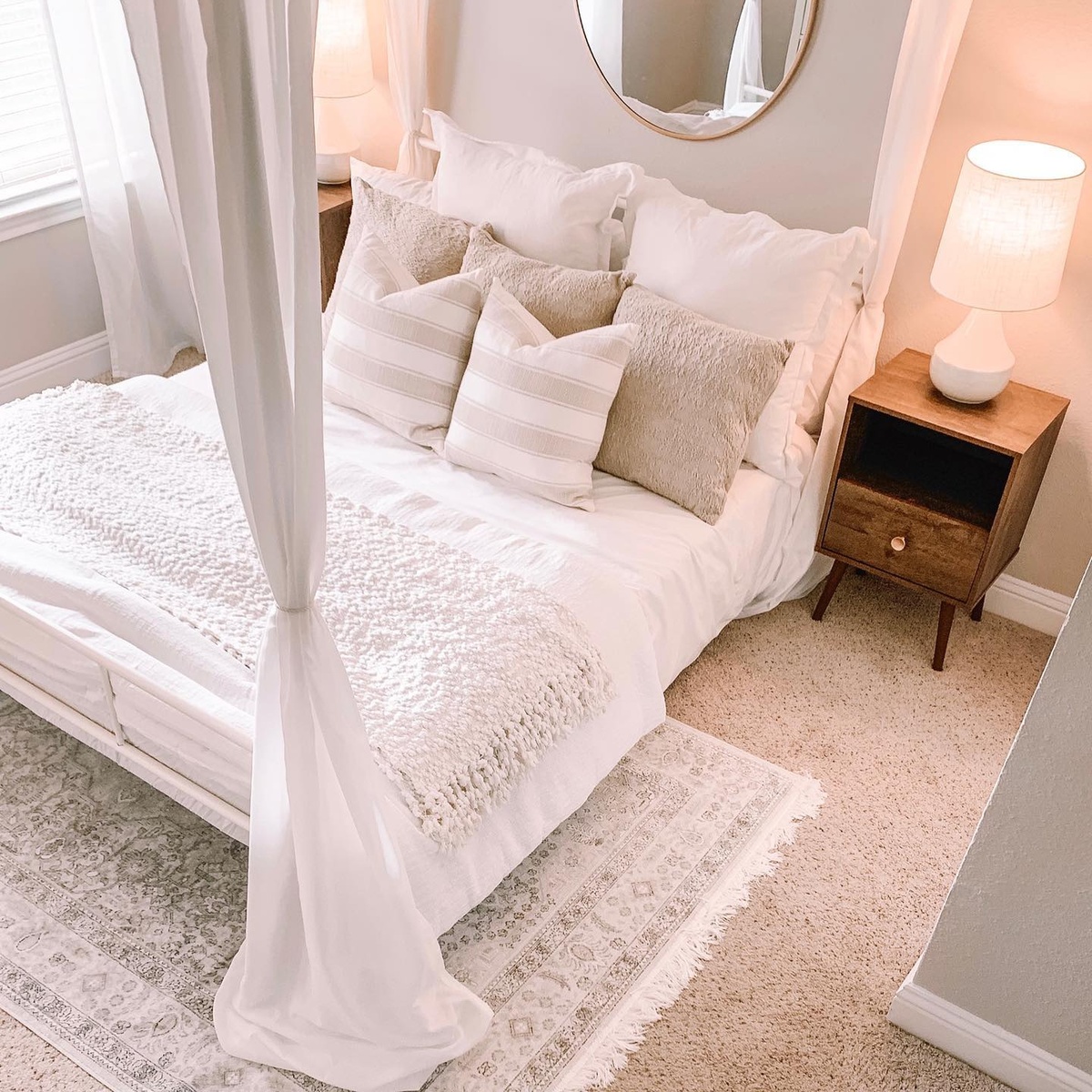 The bed’s frame may be simple or ornate, but the key feature is the canopy draped with delicate materials like chiffon, lace, or gauzy linen.