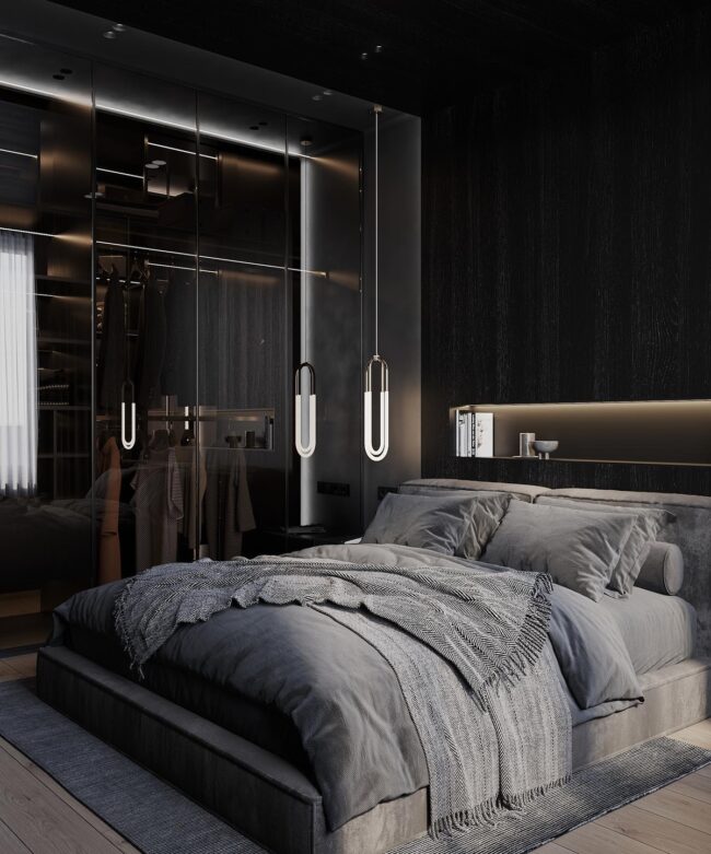 Transform your bedroom into a luxurious, relaxing retreat with dark color schemes and elegant design elements.
