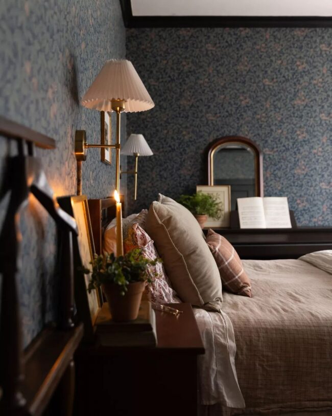 The deep, rich tones in the walls create an intimate atmosphere, while modern touches like sleek furniture balance out the vintage decor.