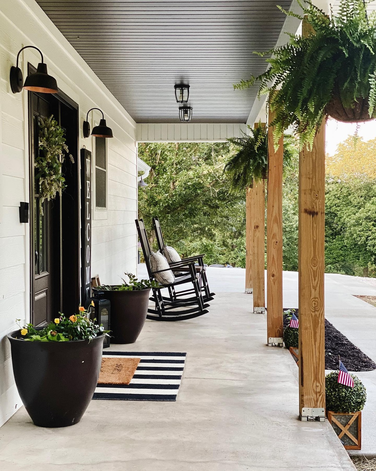 The modern farmhouse living concept combines rustic charm with contemporary elements, making this porch both welcoming and stylish.