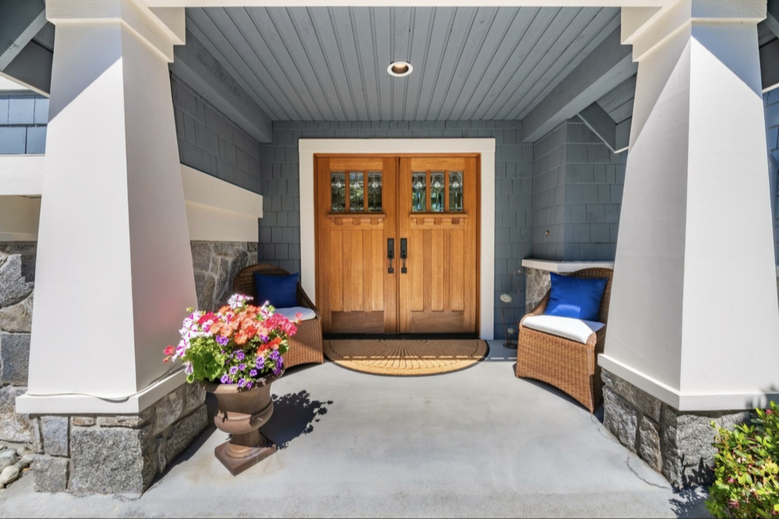 Coastal colors bring a refreshing vibe to this porch, evoking feelings of serenity and calm.
