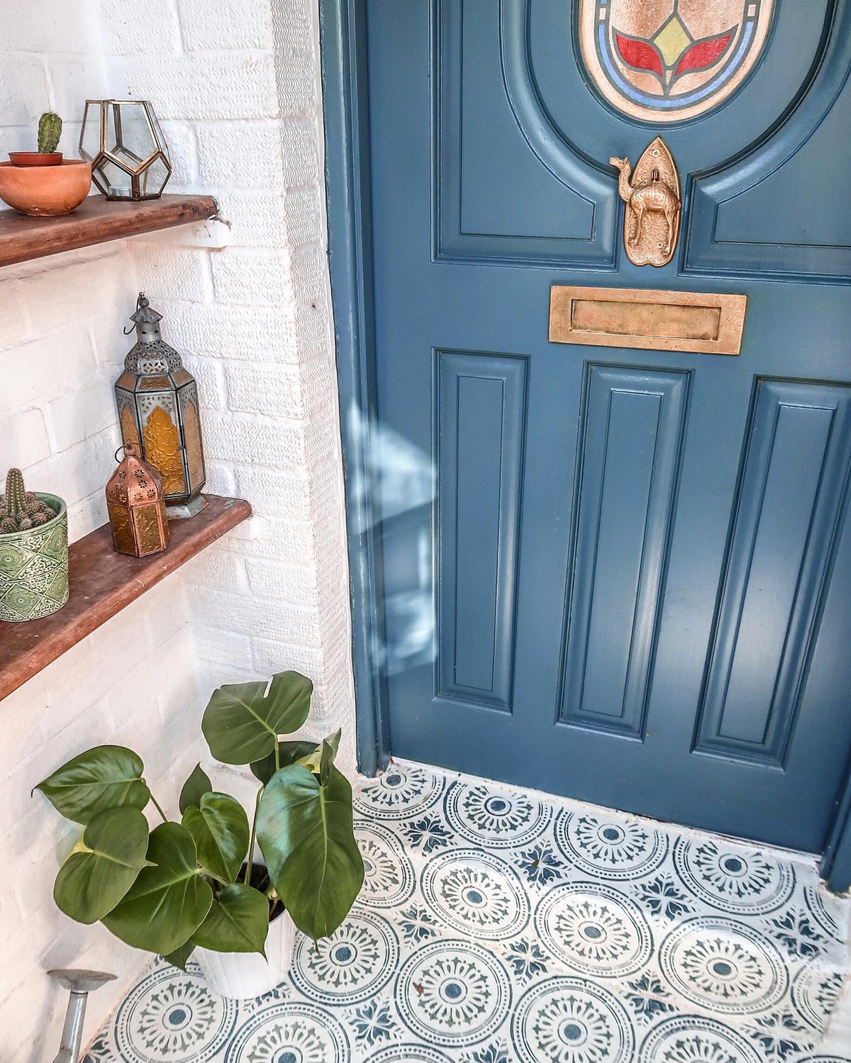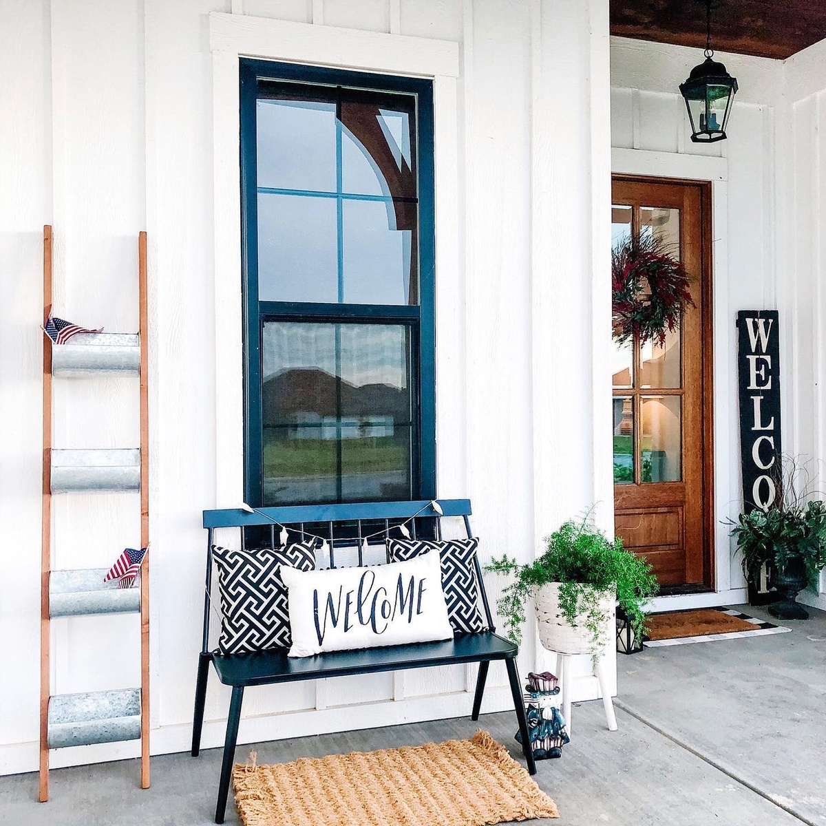 Simple, thoughtful additions like a ‘WELCOME’ mat and vintage lanterns add to the charm of this space.