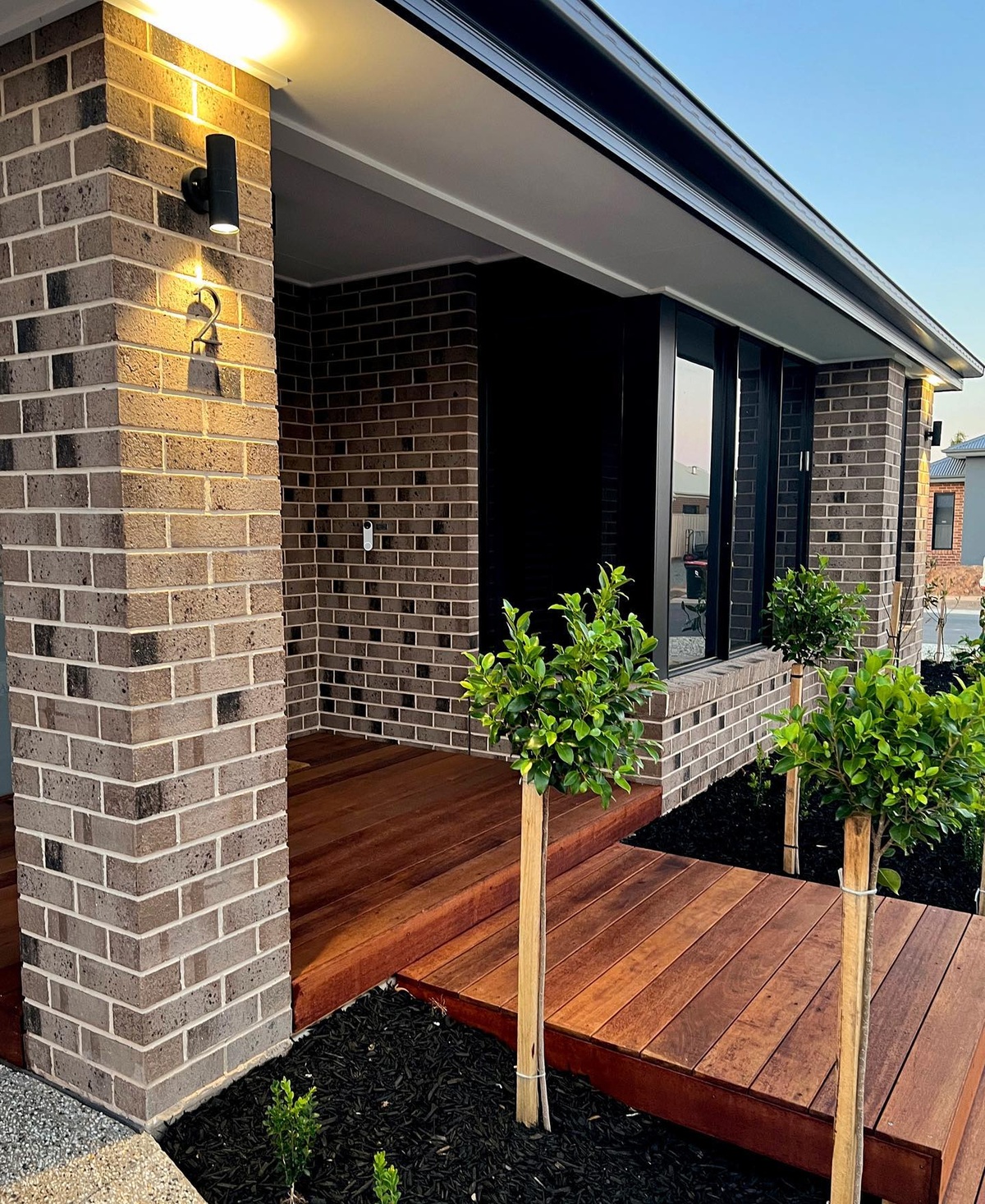 This porch is an ideal spot to unwind and experience the fusion of warmth and modern style.