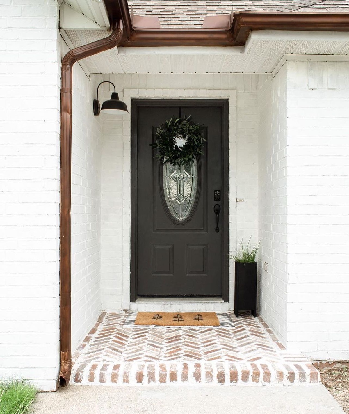 The modern door frame pairs beautifully with vintage-inspired lanterns, creating a juxtaposition of old and new.