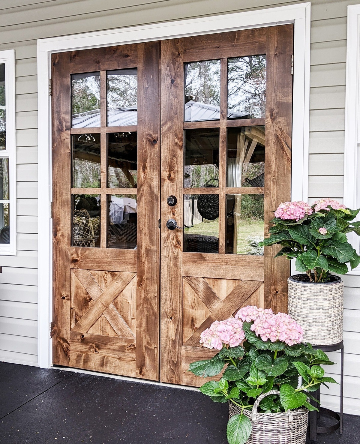 Every detail, from the oversized wooden door to the baskets of blooming plants, adds to the story of this inviting space.