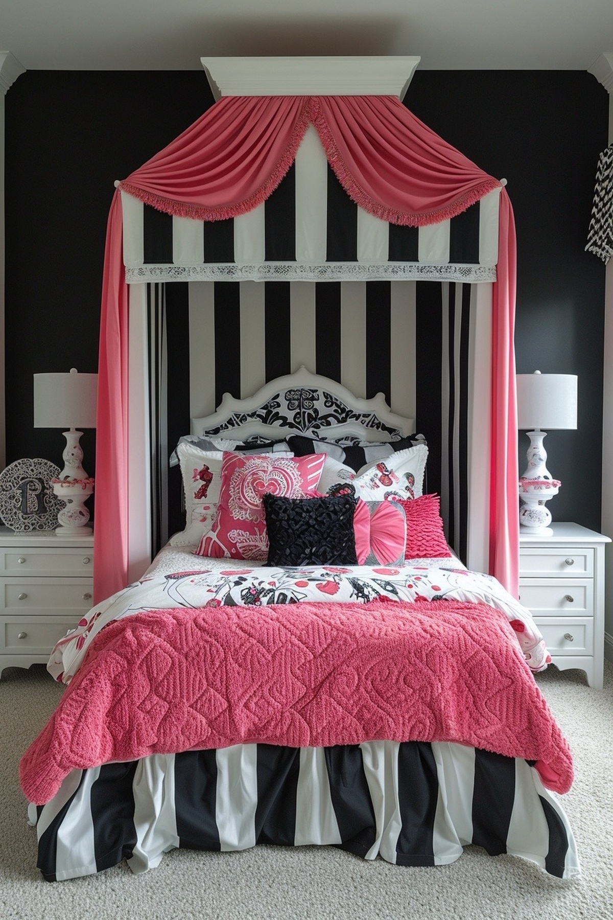 Bold bedroom theme is a striking fusion of modern glam and playful patterns. Black-and-white striped walls create an eye-catching backdrop that contrasts beautifully with vibrant pink accents, sparking energy in the space.