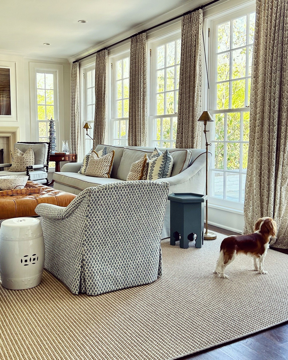 A simple rug with a delicate pattern serves as the foundation, allowing the room’s natural light to fill the space.