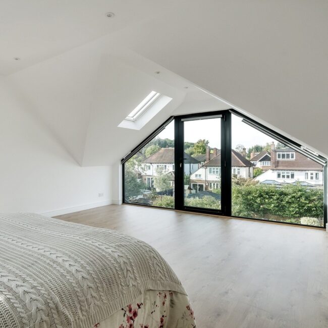 Modern minimalism meets sophisticated style in this attic bedroom, where the sloped ceiling enhances the room’s sense of space.
