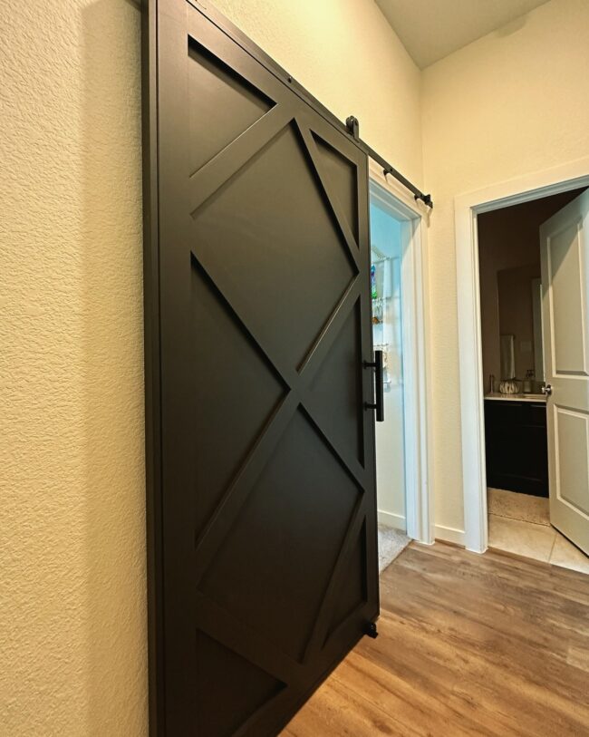 A perfect mix of practicality and charm, this barn door’s natural wood finish creates a cozy, inviting space.