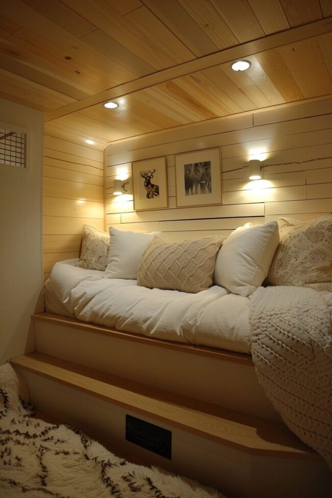 Lighting plays a crucial role here, enhancing the inviting feel with strategically placed fixtures that illuminate without overpowering. Functional areas are designed thoughtfully; steps lead up to your cozy spot, maximizing comfort and usability.