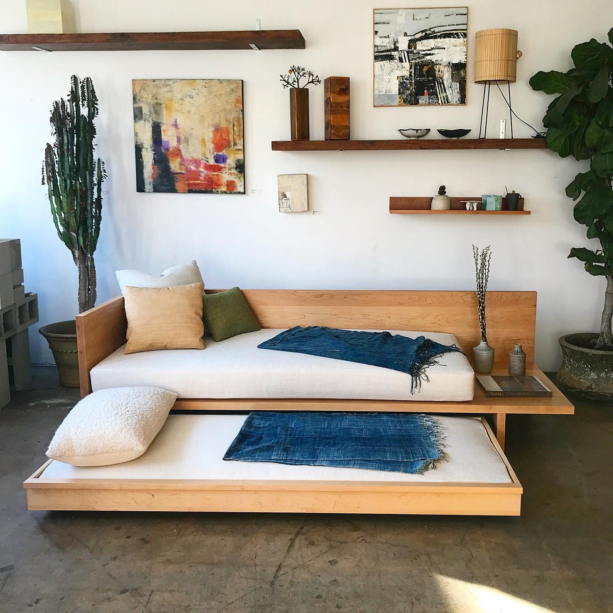 A trundle bed doubles as a sofa during the day, making it an ideal piece for a compact space.