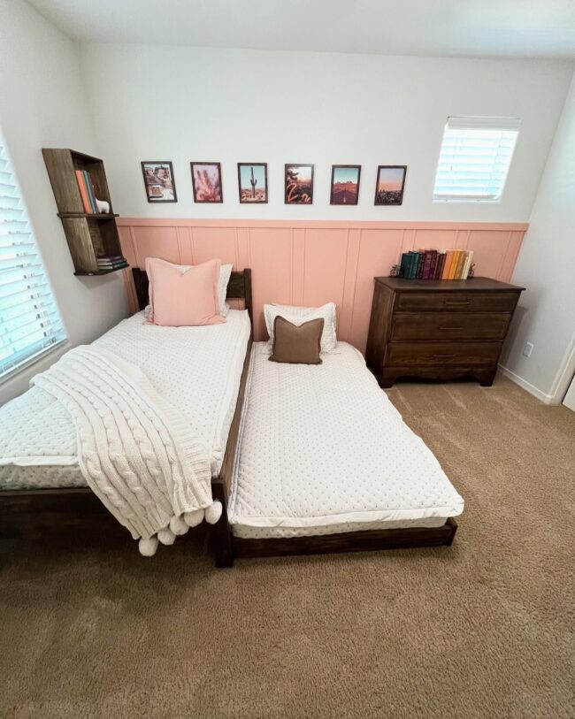 This setup is ideal for a girls’ room or a guest room, combining both practicality and charm.