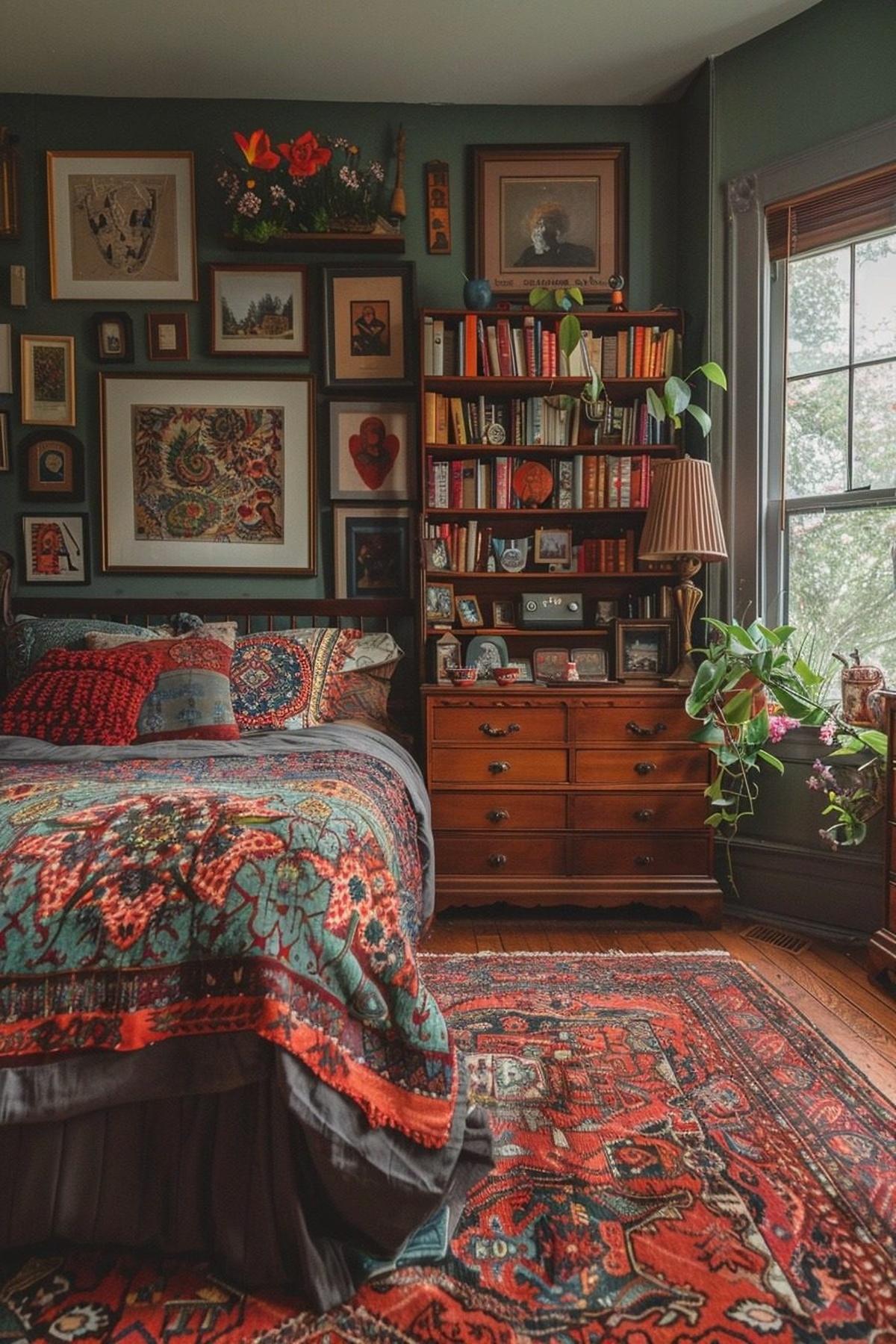 Bohemian-inspired bedroom is a vibrant celebration of eclectic design and rich cultural elements. Layered textiles in bold colors adorn the bed, creating a dynamic interplay between patterns that invites curiosity.
