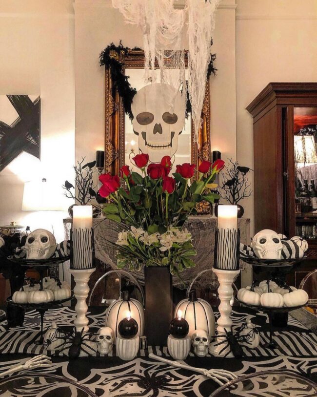 You can add a few golden accents for a refined touch, making the whole setup feel both chic and spooky.