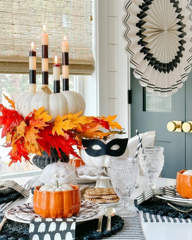 The balance between fall and spooky elements creates a festive yet sophisticated ambiance.