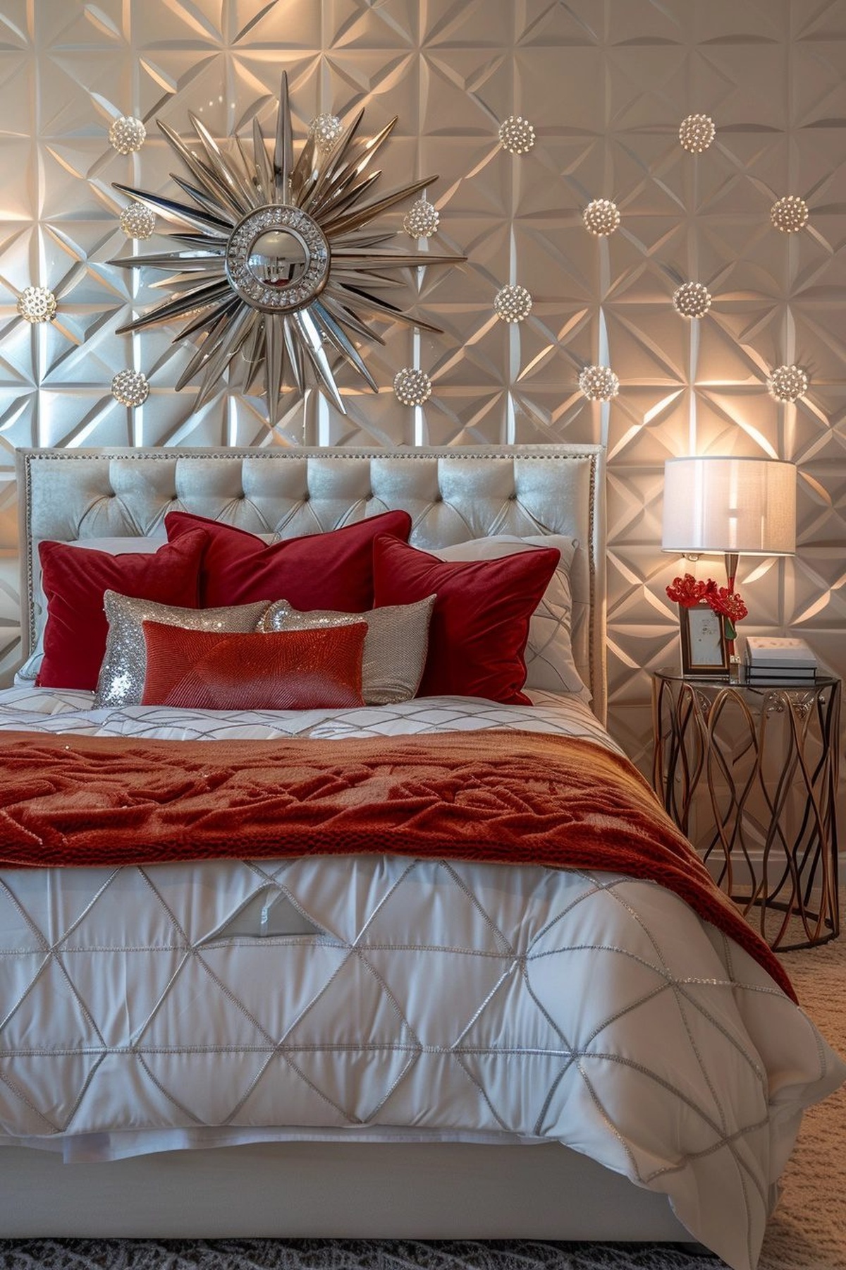 Luxurious bedroom design features a stunning 3D wall panel that adds depth and texture, creating an eye-catching backdrop. Rich red tones dominate the space through plush pillows and throws, delivering warmth while inviting relaxation.