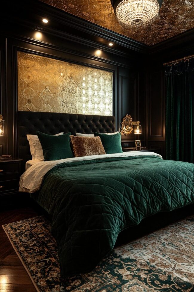 Rich jewel tones are captivating elements that bring depth to any space. The deep teal walls create a striking backdrop, while the opulent velvet bedding adds a layer of texture and warmth.