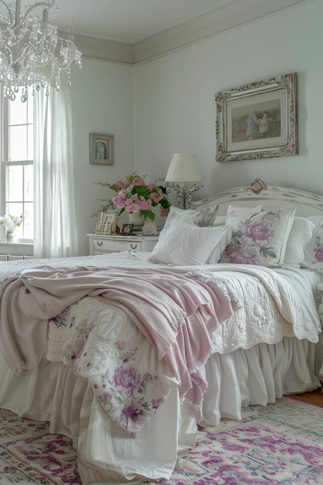 Layered textiles, from quilted bedding to ruffled curtains, enhance the cozy, inviting aesthetic.